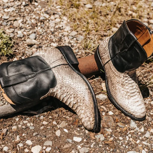 This Ain’T Our First Rodeo But Next Time You’Ll Be Wearingdesperado. Designed With Genuine Exotic Ostrich And Python Leathers, This Mid Calf Boot Hits Just Right.Featuring A Single Exterior Pull Strap And An Inside Working Brass Zip Closure.
