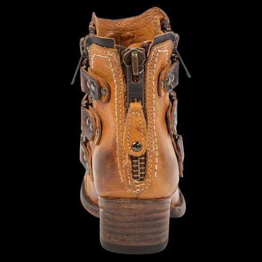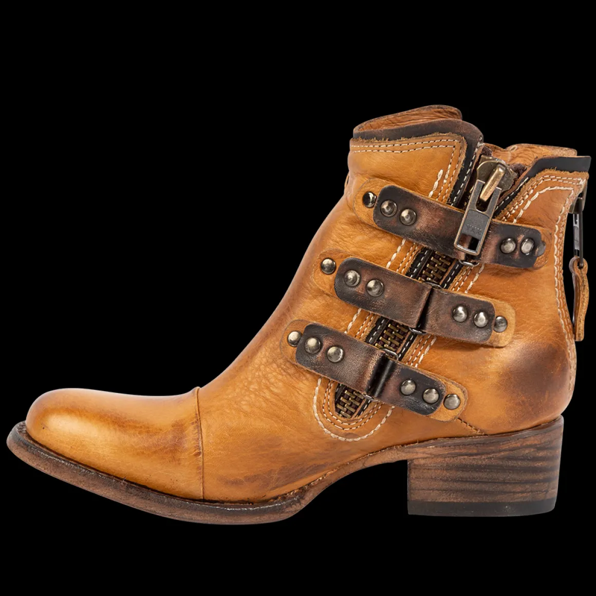 Step Out In Style With Grecko. This Low Heel Bootie Features Symmetrical Studded Straps, A Functioning Heel Brass Zip Closure, And Round Toe For Comfort. Keeping You On The Go All Season Long.