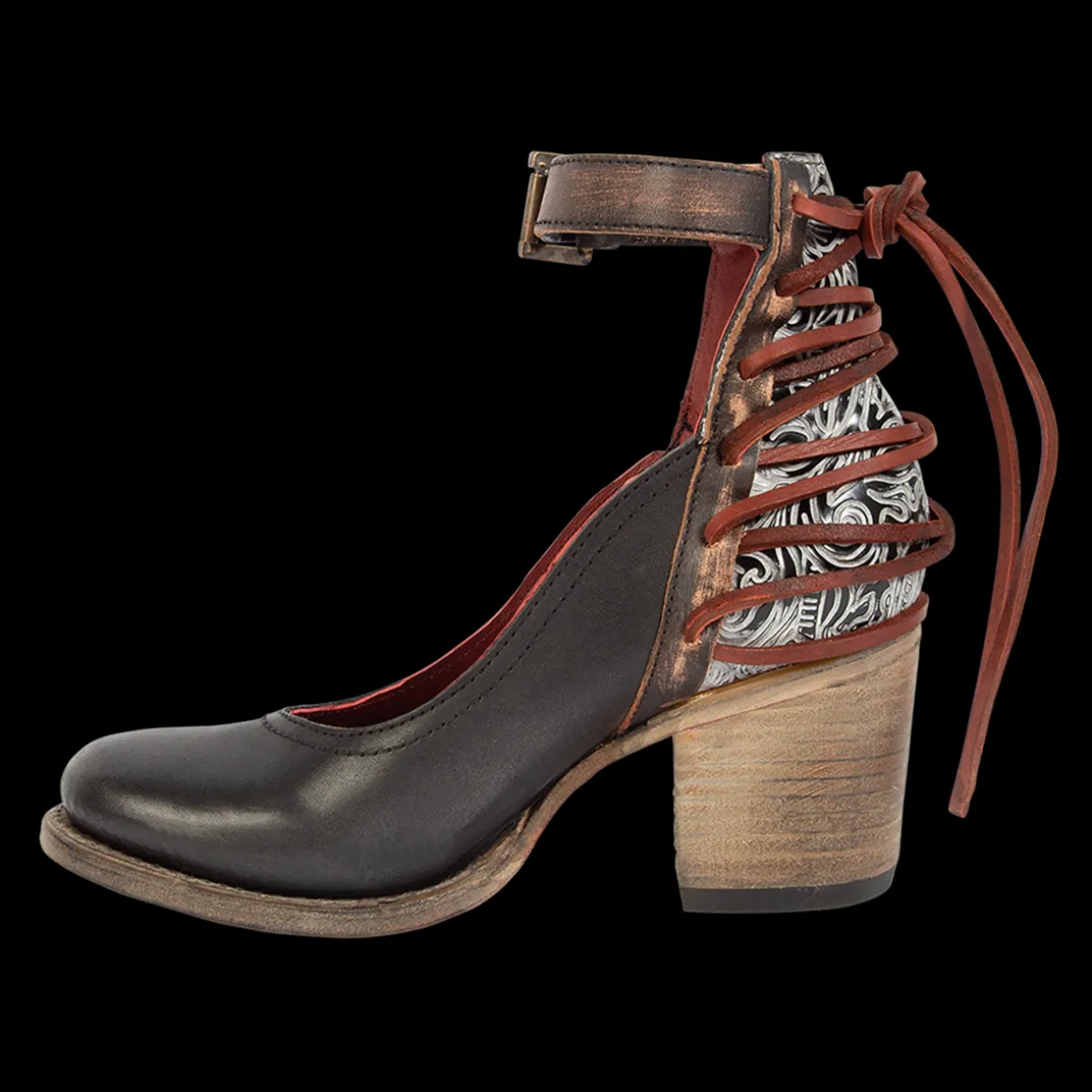 Adorned With Leather Laces And Embossed Detailing On The Back Panel, Raeanne Is Crafted With An Open Instep And Mid-Heel Creating An Effortless Look. For The Perfect Customizable Fit,This Shoe Is Finished With An Adjustable Ankle Strap And Brass Hardware.