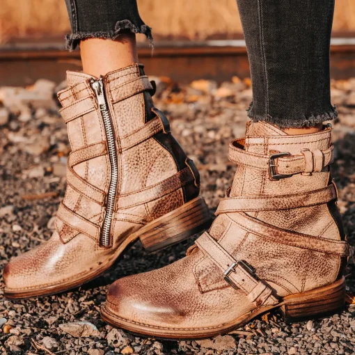 Raine – The Ruler Of Ultimate Comfort. Constructedwith Astacked Wooden Heel, Round Toe, And Inside Zip Closure Making For Ease Of Wear. This Bootie Is Detailed With An Overlapped Shaft And Includes Adjustable Buckle Straps For A More Customizable Fit.