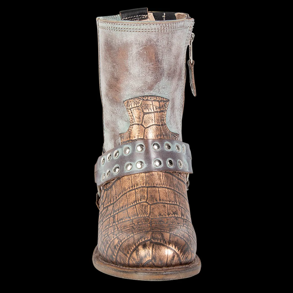 Ramone Is “Wanted” For Beingbold And Rebellious. This Full-Grain Leather Ankle Bootie Is Constructed Witha Western Shaft Crown, An Inside Zip Closure, And Paired With An Outside Welt. Finished With An Embellished Harness, Making Ramone A High Reward Item.