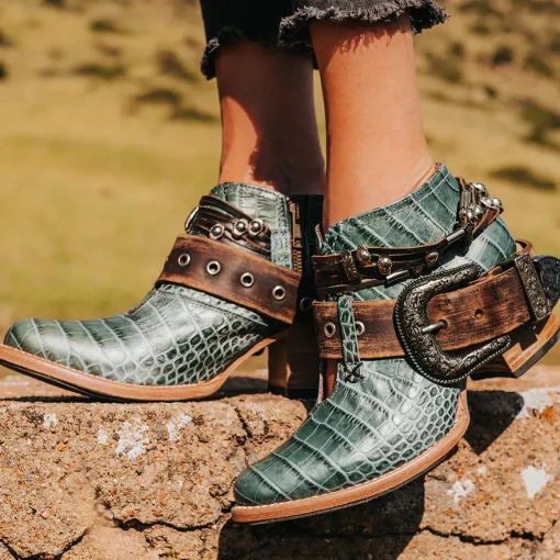 Bring The Wild West To The City Streets In The Saloon. With A Western-Inspired Silhouette, This Bootie Features A Small Front Cutout, A Slightly Curved Almond Toe, And An Inside Brass Zip Closure. Saloon Delivers Genuine Western Flair With Its Detailed Large Silver Buckle And Embellished Leather Belting.