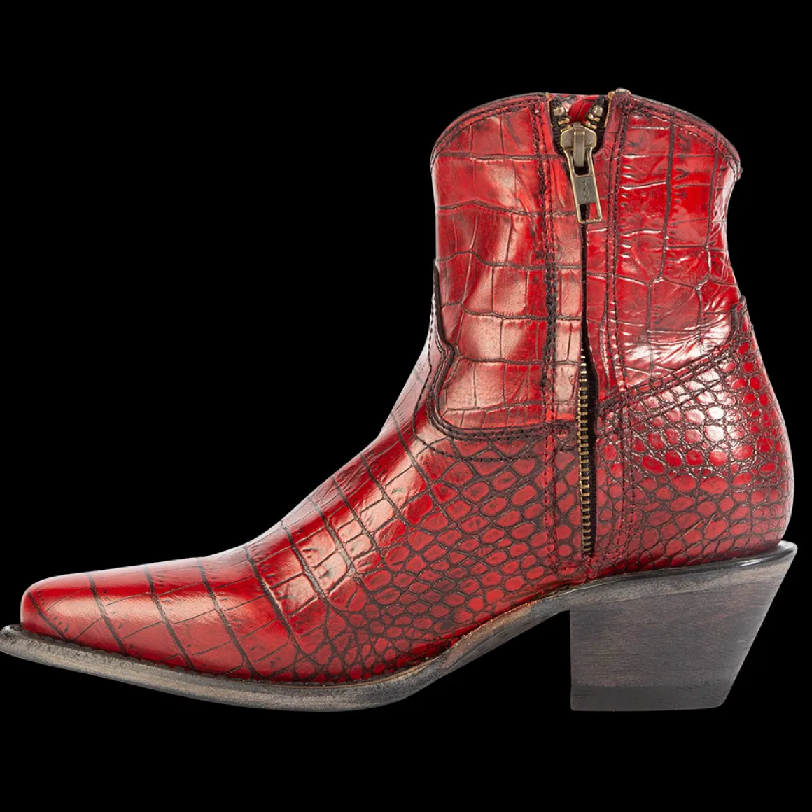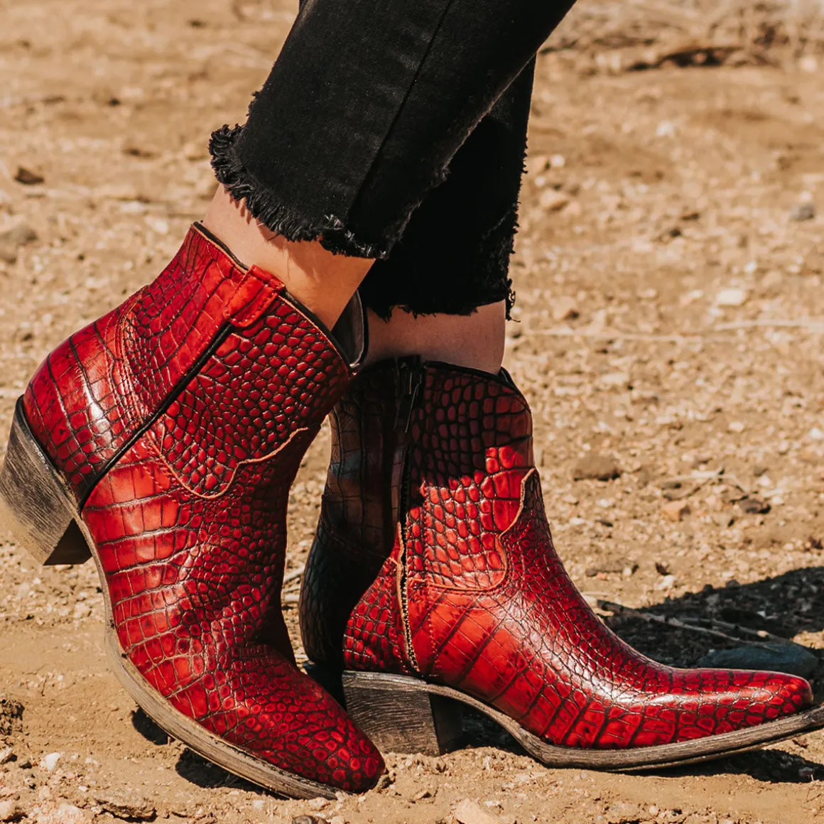 Welcome To The Wild West – Miramar. Constructed With A Western Silhouette, Thisstandoff Worthy Bootiesits On A Low Heel And Showcases A Traditional Snip Toe. Decorated In Embossed Leather And Finished With A Working Brass Zip Closure, Miramar Will Have Us All Shaking In Our Boots.