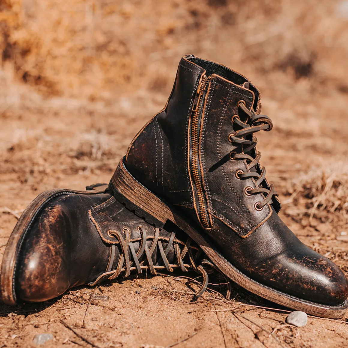 Pairing Classic Cool With Contemporary Edge – Pendleton. Constructed On A Low Heel, This Distressed Leather Boot Is The Perfect Balance Of Strength Andstyle With A Brass Zip Closure, Customizable Leather Lacing, And Almond Toe.