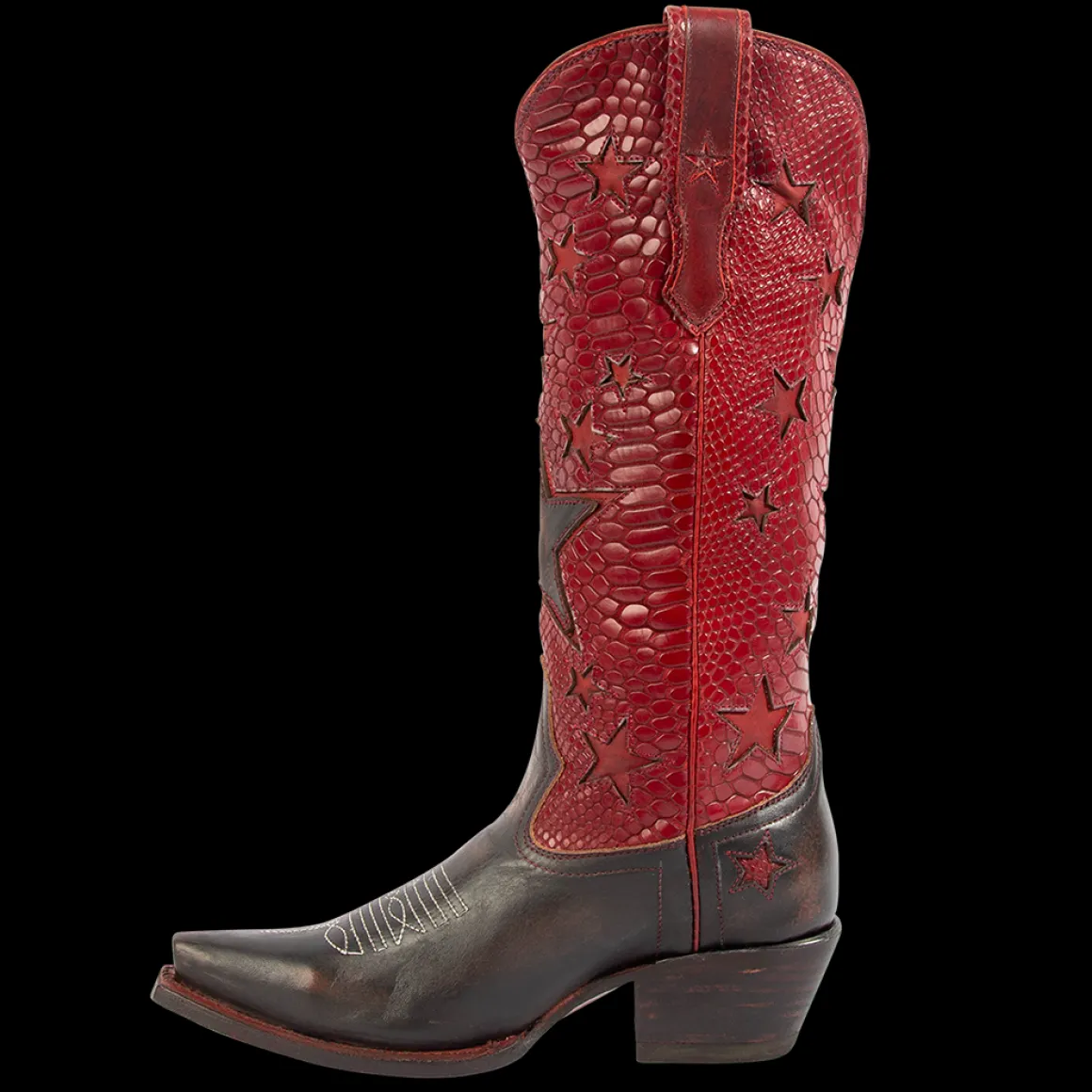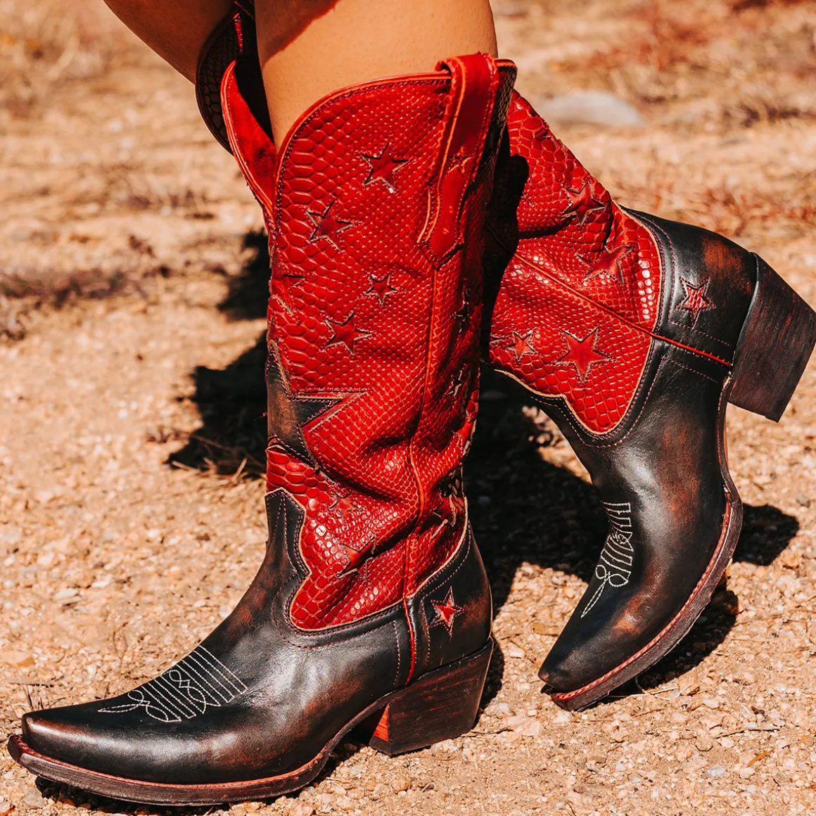 Displaying A Smooth And Embossed Leather Shaft With Intricate Inlay Detailing,This Western Silhouette Will Have You Reaching For The Starzz. Constructed With A Snip Toe, Traditional Stitching, And Completed With Exterior Pull Straps.
